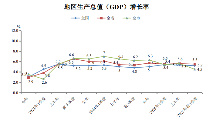 根据地区生产总值统一核算结果,2025年前三季度全市地区生产总值1058.57亿元,按不变价格计算,同比增长4.5%,增速分别低于全国(5.2%)、全省(5.5%)0.7个、1个百分点。其中,第一产业增加值70.12亿元,同比增长4.2%,增速分别高于全国(3.8%)、全省(3.5%)0.4个、0.7个百分点;第二产业增加值585.14亿元,同比增长3.6%,增速分别低于全国(4.9%)、全省(5.2%)1.3个、1.6个百分点;第三产业增加值403.31亿元,同比增长6.0%,增速高于全国(5.4%)0.6个百分点、与全省(6.0%)持平。