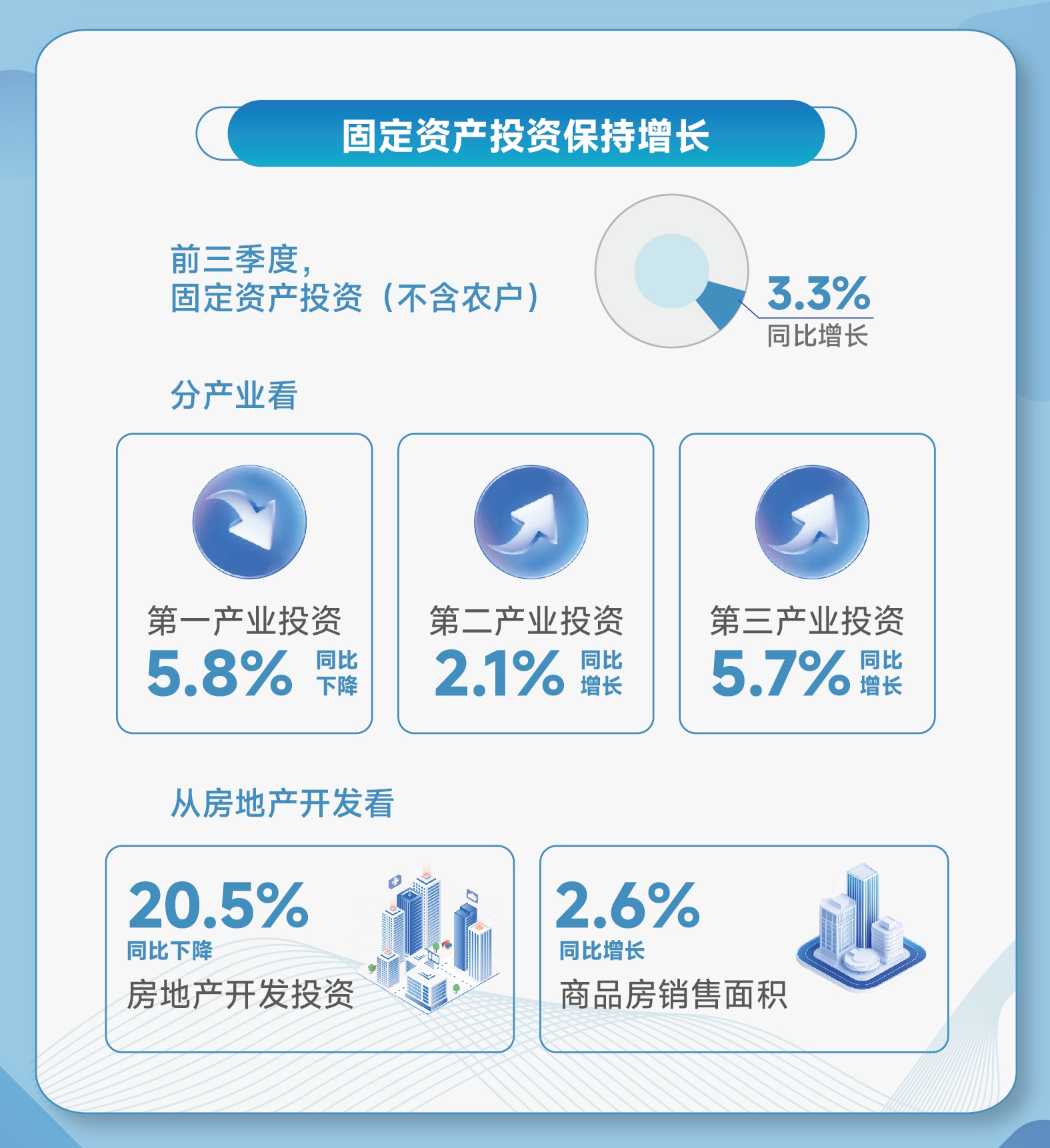 分产业看,第一产业投资同比下降5.8%,第二产业投资同比增长2.1%,第三产业投资同比增长5.7%。