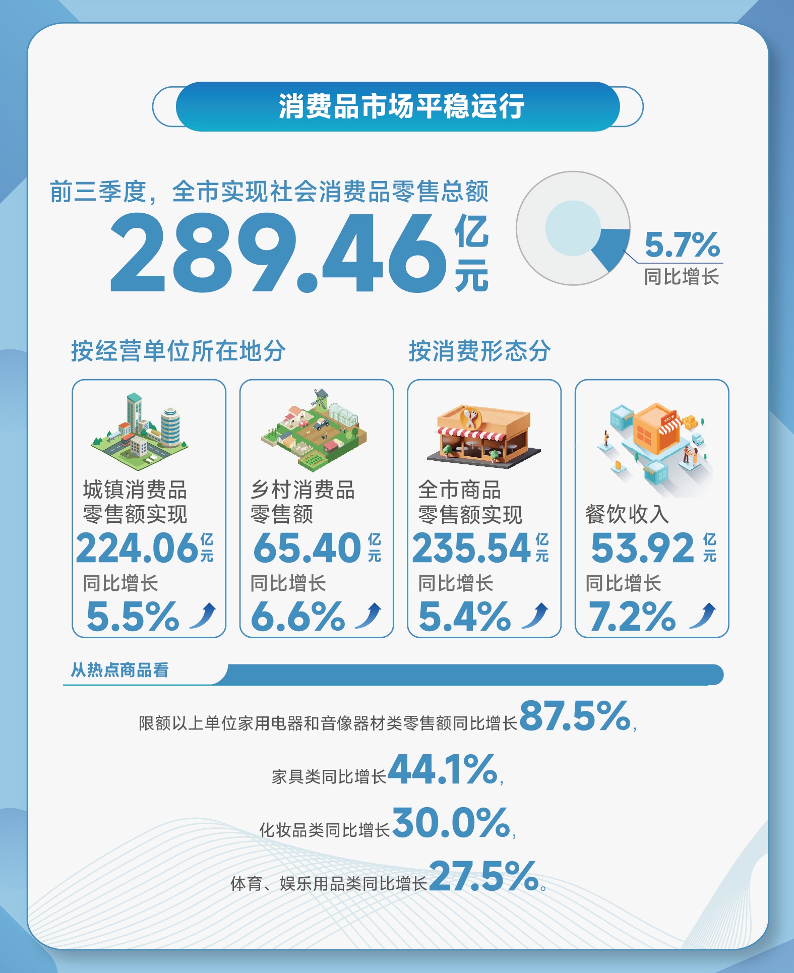 按消费形态分,全市商品零售额实现235.54亿元,同比增长5.4%;餐饮收入53.92亿元,同比增长7.2%。