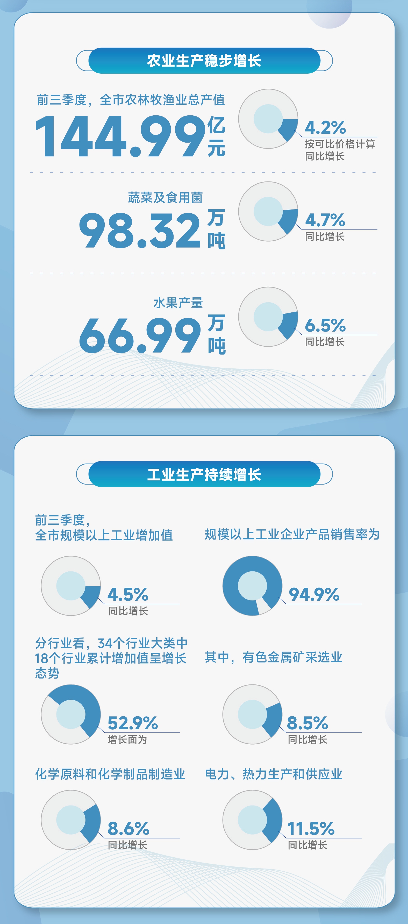 前三季度,全市规模以上工业增加值同比增长4.5%,增速分别低于全国(6.2%)、全省(7.1%)1.7个、2.6个百分点,规模以上工业企业产品销售率为94.9%。