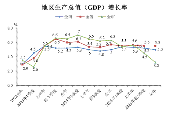 2025年,全国经济总量首次突破140万亿元大关,增长5.0%;全省经济跑出5.5%的增速,继续担当“经济大省挑大梁”重任。在全国经济“稳中有进”、全省“成色更足”的宏观背景下,攀枝花经济顶压前行,全年实现地区生产总值(GDP)1409.57亿元,首破1400亿元关口,增长3.2%。虽增速低于全国、全省平均水平,但从发展态势看,呈现出“一季度持平全国、上半年追平全省、下半年承压下探”的波动特征,展现出资源型城市在转型阵痛期的发展韧性。