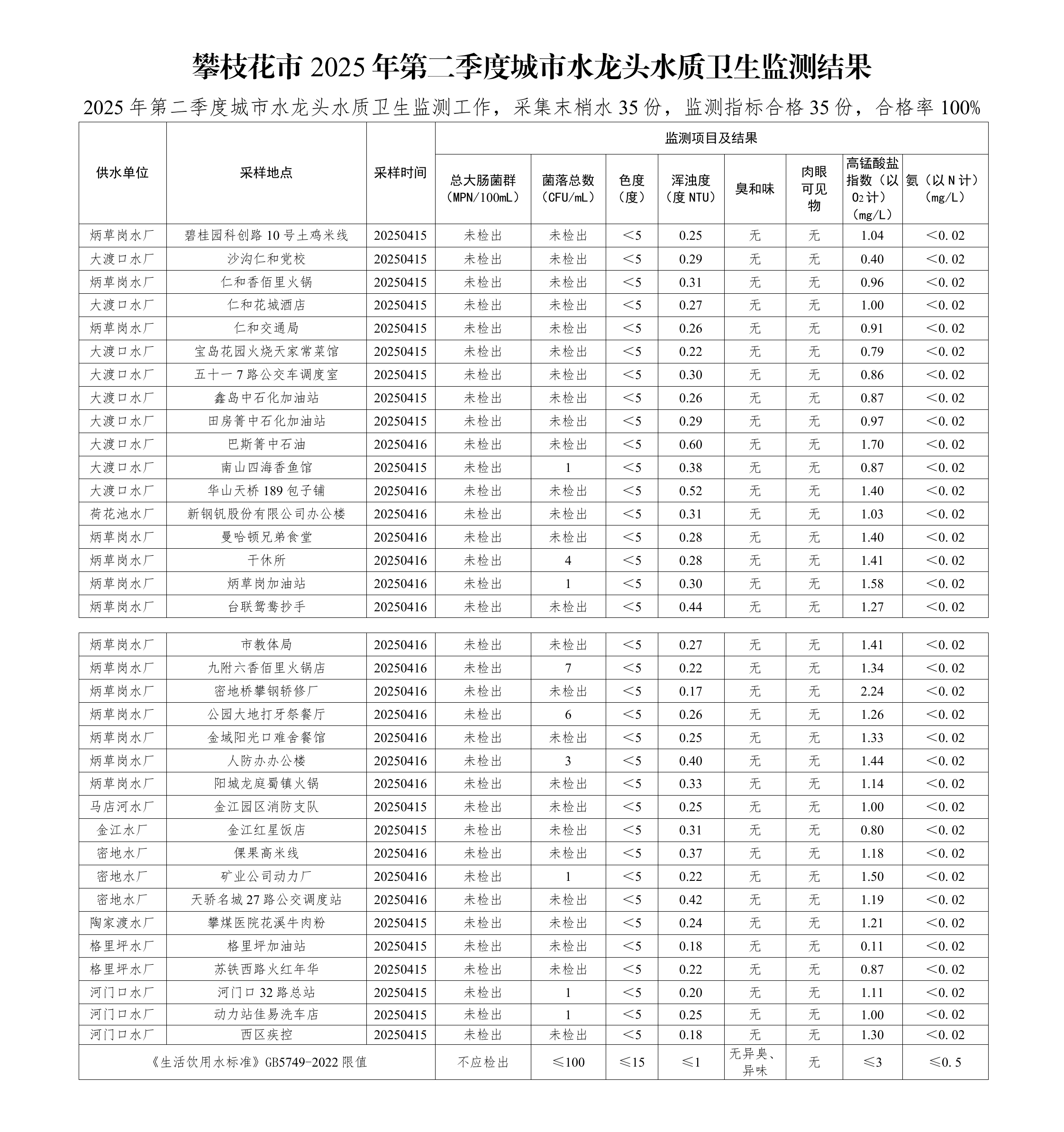 攀枝花市城市饮用水卫生状况信息公示表(2025年第二季度)