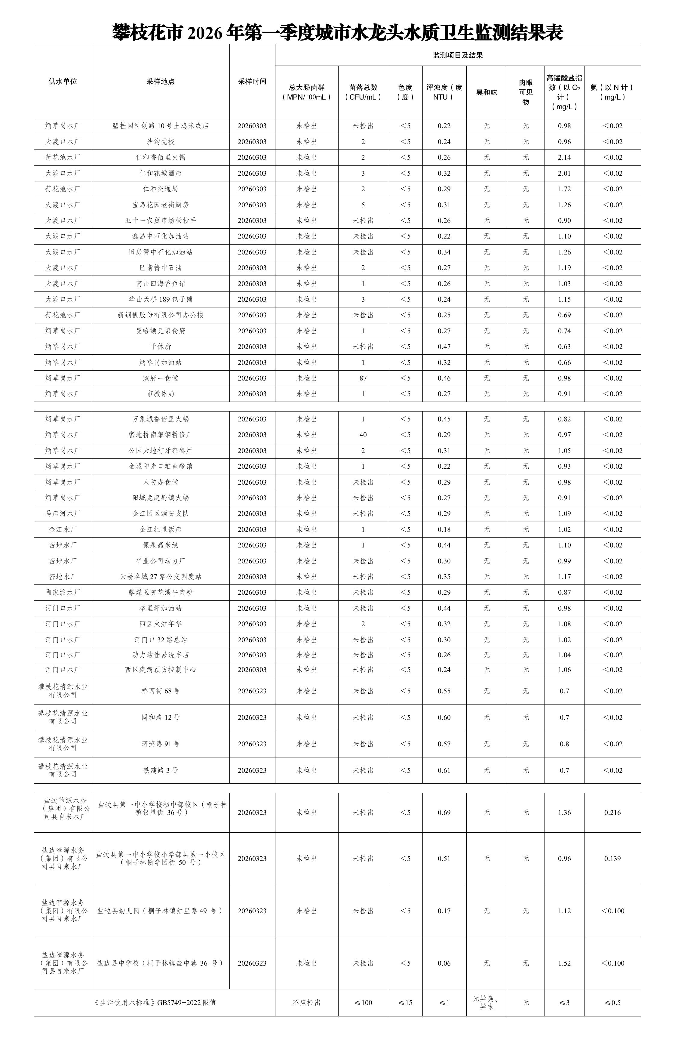 攀枝花市城市饮用水卫生状况信息公示表(2026年第一季度)