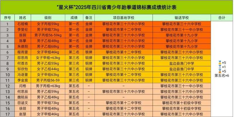 经过4天的鏖战,攀枝花代表队最终收获5金1银5铜及6个第五名的优异成绩,为此次省赛之旅画上圆满句号。每一块奖牌都浸润着汗水,每一次得分都凝聚着坚持,少年们用拳脚生动诠释了体育精神的真谛。