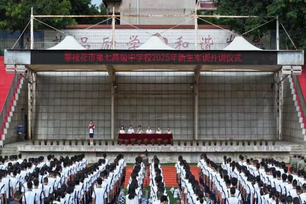 为深入贯彻党的二十大精神和党的二十届三中全会精神,全面落实党的教育方针,切实加强素质教育和国防教育,2025年9月1日上午,攀枝花市第七高级中学校在两校区同步举行高2025级军训开训仪式。西城校区军训任务由西区人民武装部承担,花城校区由仁和区人民武装部承担。西区人民武装部上校部长政治委员李锐、党支部副书记兼学生军训办主任杜维勇,仁和区人民武装部副部长申旭初、军事科参谋佘理侨,以及学校领导班子成员、相关部门负责人分校区出席仪式。