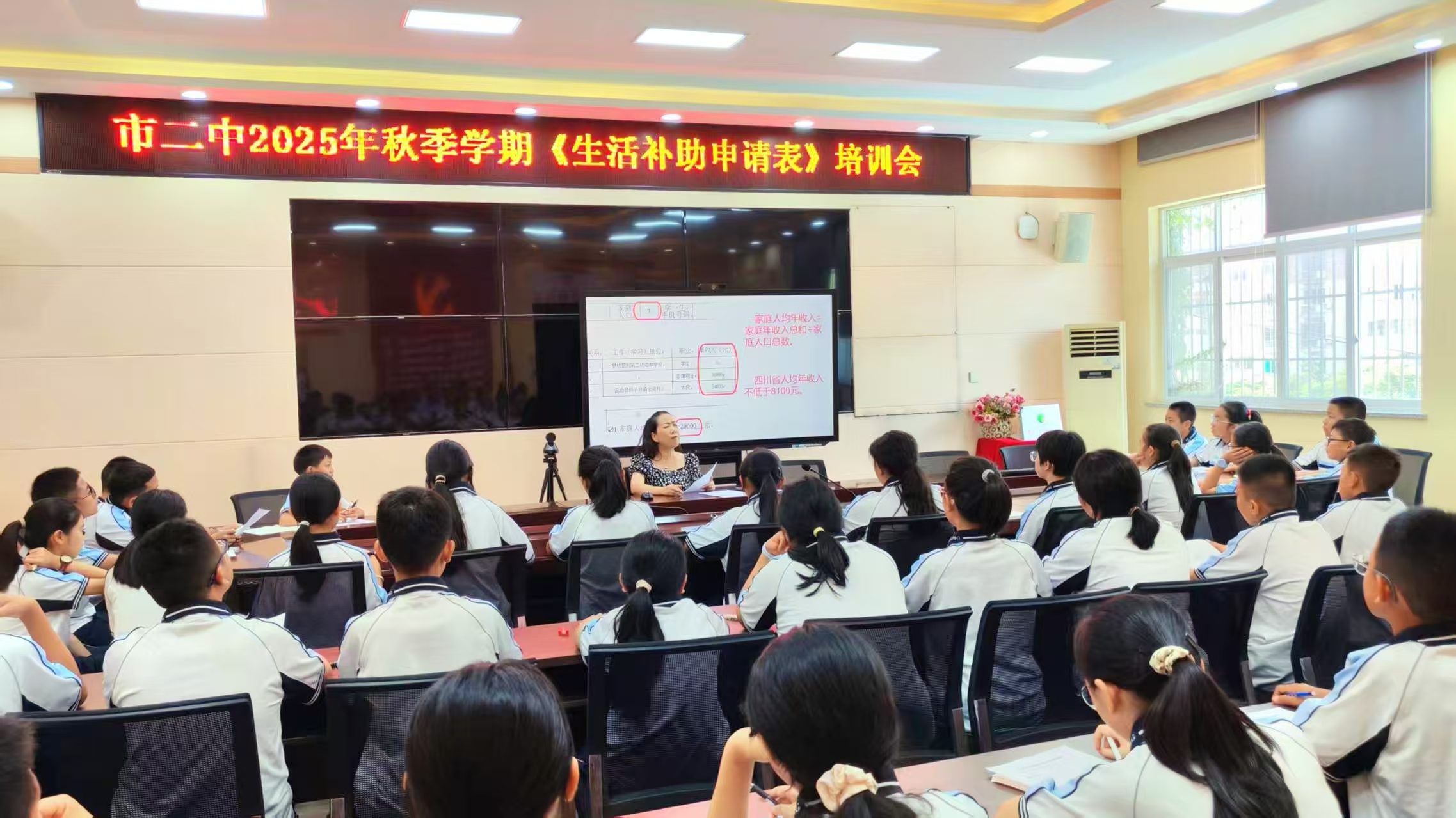 为进一步贯彻落实国家学生资助政策,确保家庭经济困难学生顺利申请并享受资助,切实提升资助工作的精准性与实效性,市二中于9月4日下午在会议室开展初一年级受助学生资助政策宣讲会以及《义务教育阶段家庭经济困难学生生活补助申请表》填表指导。活动由安全科科长周均主持,初一年级全体受助学生参会。