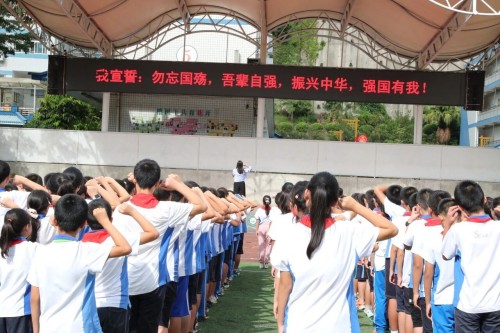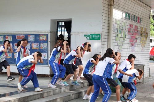 当预警声响起,同学们双手抱头、弯腰低身,躲在课桌旁,筑起首道“生命防线”。在空袭警报拉响时,师生们按照疏散路线,抱头、弯腰、快步撤离,无推搡喧哗,4分38秒全员抵达安全区。随后,各班清点人数逐级上报;全员到齐,演练圆满告成。默哀环节,全体师生肃立,向94年前死难的同胞致哀、向浴血先烈们致敬。在领誓人带领下,大家紧握右拳向国旗庄严宣誓:“勿忘国殇,吾辈自强;振兴中华,强国有我!”童声铿锵,回荡校园,直击人心。