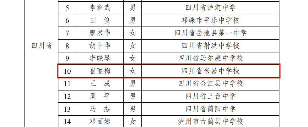 四川省米易中学校崔丽梅教师 入选首批全国县域普通高中头雁教师岗位计划
