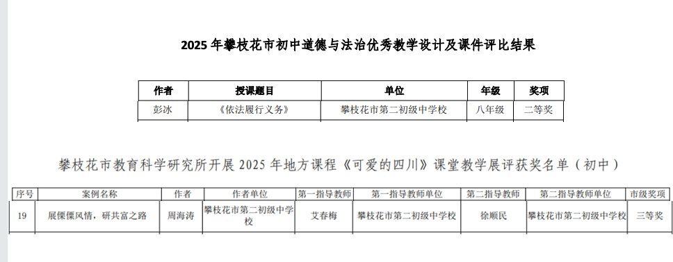 近日,从攀枝花市教育科学研究所接连传来喜讯,市二中教师在全市两项重要的教学评比活动中表现优异。在攀枝花市教科所组织开展的全市初中道德与法治七、八年级同课异构优秀教学设计及课件评比中,攀枝花市第二初级中学彭冰老师凭借其精心设计的课程《依法履行义务》,在全市众多参赛作品中脱颖而出,荣获市级二等奖。同时,在2025年地方课程《可爱的四川》课堂教学展评活动中,由艾春梅和徐顺民老师指导,周海涛老师执教的《展傈僳风情,研共富之路》课例,荣获市级三等奖。这充分展现了市二中教师扎实的教学功底和卓越的育人风采。