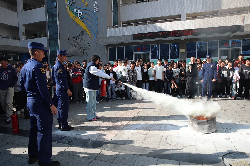 随后进行的灭火演示将活动推向了一个小高潮。消防员现场示范了用干粉灭火器扑灭火盆的正确步骤和要领——“提、拔、握、压”。在消防员的专业指导和保护下,受邀的学生代表踊跃上前,亲身体验了灭火过程,成功将“理论”转化为“实践”。