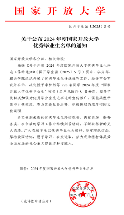 近日,国家开放大学2024年度奖学金及优秀毕业生名单出炉,攀枝花开放大学的16名学员上榜。其中,辜雁等15名同学荣获2024年度国家开放大学奖学金,彭方荣同学获评2024年度“国家开放大学优秀毕业生”荣誉。他们以勤奋为桨,在终身学习的海洋中勇毅前行,取得骄人成绩,彰显攀枝花开放大学教育的丰硕成果。向所有获奖同学表示热烈的祝贺!