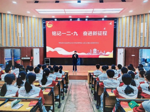 仪式开场,全场肃立,激昂的《中华人民共和国国歌》奏响。学校党委书记余晓梅为新团员讲授“青春思政课”,以“一二?九”爱国精神为底色,鼓励新团员将个人成长融入家国发展,用信仰领航、以实干作答,让青春在强国路上绽放光彩。