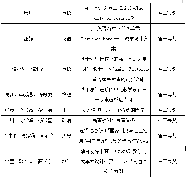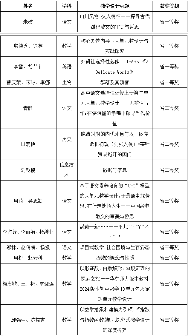 近日,四川省中学校长协会、四川省教育学会教育管理专业委员会正式公布第四届新教材单元教学设计评比活动获奖结果。市七中教师凭借深厚的专业素养、对新课程理念的深刻理解及创新的教学实践,在此次省级赛事中表现亮眼,共有45名教师荣登获奖榜单,其中一等奖8人、二等奖3人、三等奖34人,获奖成果覆盖语文、数学、英语、物理、化学、生物、政治、历史、地理、信息技术等多个学科,充分彰显了学校在新教材深度研读、单元教学创新设计及新课程落地实施中的整体优势与雄厚师资实力。