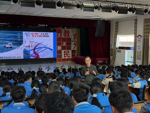 宣讲会上,卢克研究员以“逐梦蓝天·扎根乡土·科技报国”为主题,结合我国航空事业四十年的波澜壮阔的发展历程,深情讲述了歼-10系列、歼-20、枭龙战机等国之重器背后的研发故事,用生动的案例、详实的细节,直观展现了科技工作者们“十年磨一剑”的攻坚精神与“为国铸重器”的责任担当。宣讲过程中,他深入师生中间,耐心解答了同学们关于“战机研发瓶颈”、“学业与创新平衡”及“青少年科技素养培养”等热点议题,鼓励青少年要保持好奇心,敢于质疑,勇于探索,在夯实基础知识的过程中培养创新思维,特别结合攀枝花钒钛资源优势与地方科技创新特色,寄语盐边学子,既要胸怀天下,又要立足乡土,将个人理想融入国家发展大局,以实干践行“强国有我”的铮铮誓言。