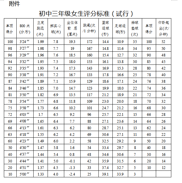 附件:初中三年级女生(男生)评分标准(试行)