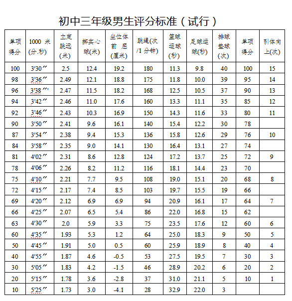 2.考试方法和评分标准:考试方法按照《国家学生体质健 康标准》(2007年修订)执行,评分标准见附件。
