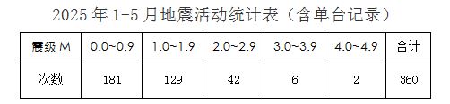 2025年1-5月地震活动统计表及多台定位震中分布图如下所示: