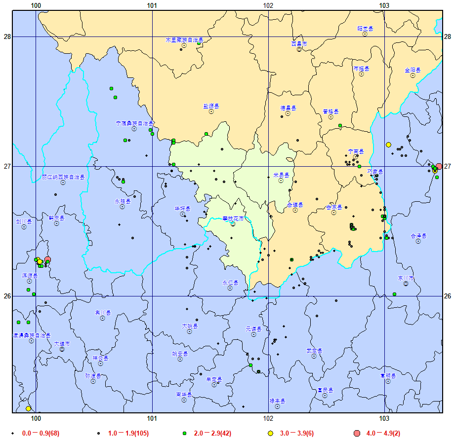 2025年5月,攀枝花市地震监测中心共监测到本市及周边地区地震58次(多台定位30次,单台记录28次),最大地震为5月21日00时29分云南昭通市巧家县(北纬27.14°,东经102.96°)3.4级地震。攀枝花市辖区内共监测到1次可定位地震,为5月16日02时01分盐边县渔门镇1.1级地震。