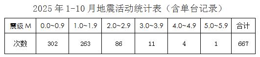 2025年1-10月地震活动统计表及多台定位震中分布图如下所示: