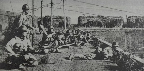 1931年9月19日,日本军队在沈阳小西门城墙上向城内射击。