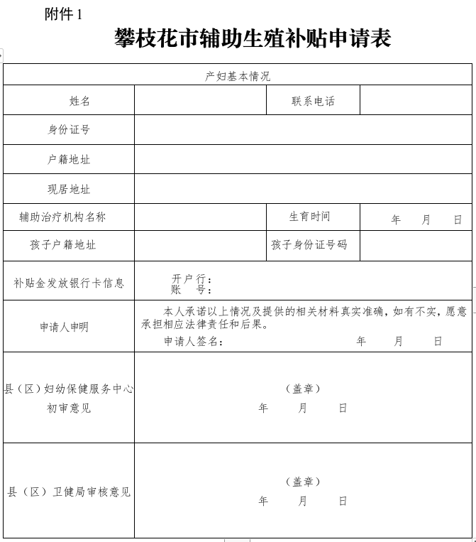 (一)《攀枝花市辅助生殖补贴申请表》(附件1)。
