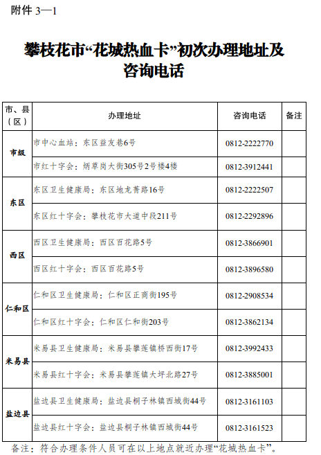 附件:3—1.攀枝花市“花城热血卡”初次办理地址及咨询电话