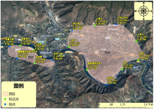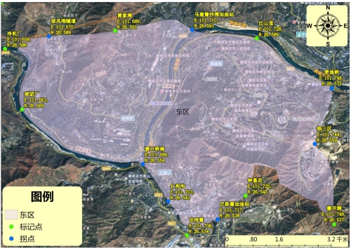 清香坪至大水井片区:东起凉风坳隧道(E:101.670,N:26.589)西端,南临金沙江(E:101.637,N:26.569),西至河石坝片区(E:101.613,N:26.606),北靠白岩子后山(E:101.643,N:26.610)。