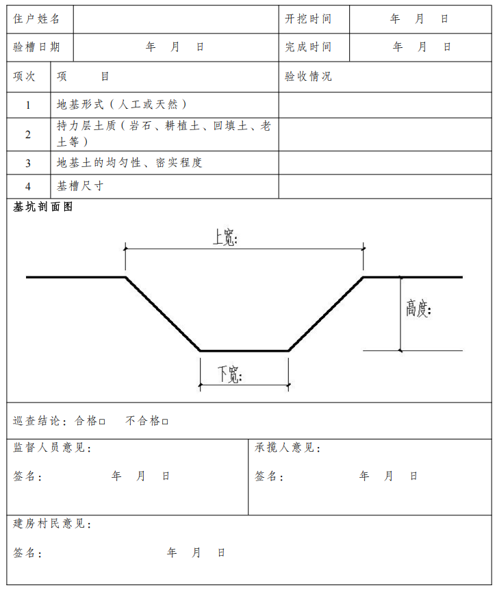 建房村民应当在开工前将开工日期、施工合同、承揽人等信息报乡镇人民政府,乡镇人民政府在开工前组织人员到现场进行开工查验。乡镇人民政府应当履行农村住房建设的监督管理职责,落实“六到场”(即现场勘查审查到场、放线定位到场、基坑基槽验收到场、主体结构施工到场、主体结构完工到场、竣工验收到场)要求。及时组织农村住房建设管理人员、技术服务机构或者专业技术人员,对农房建设的地基基础、主体结构、屋面、抗震构造、隐蔽工程等重要部位和环节实行过程监督管理,并记录检查情况。根据工程进度,填写《地基验槽记录表》(附件1)、《主体结构巡查记录表》(附件2)、《农村房屋建设巡查记录表》(附件3);村民委员会协助做好施工现场的日常巡查,并记录巡查情况。县(区)自然资源和规划、农业农村、住房城乡建设等主管部门按照各自职责会同乡镇人民政府对农村住房建设的规划、宅基地使用、质量安全和风貌等进行监督管理。