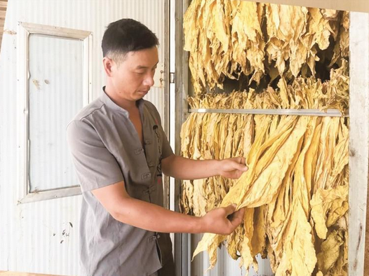 烟农正在整理烤好的烟叶。