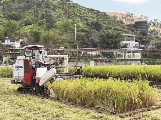 在田间地头,机声隆隆,一台台联合收割机开足马力,在金黄色的稻浪中来回穿梭,所过之处,稻穗被整齐切割、稻粒迅速脱粒、秸秆就地粉碎还田,整套动作行云流水,一气呵成。