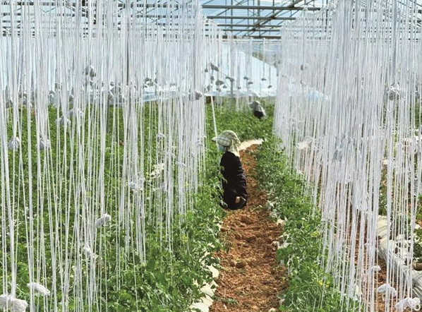果农在给番茄吊蔓绳。 (邓欣雨 摄)