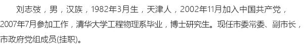 刘志弢,男,汉族,1982年3月生,天津人,2002年11月加入中国共产党,2007年7月参加工作,清华大学工程物理系毕业,博士研究生。现任市委常委、副市长,市政府党组成员(挂职)。