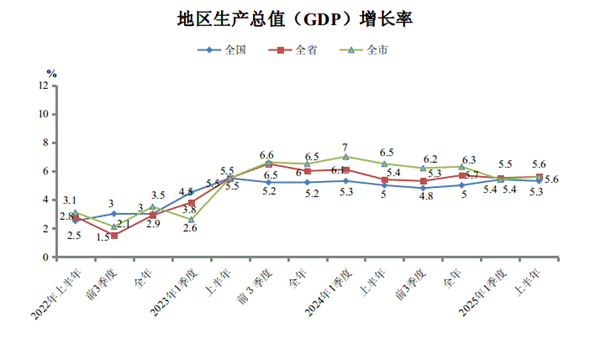 根据地区生产总值统一核算结果,2025年上半年全市地区生产总值为712.6亿元,按不变价格计算,同比增长5.6%,增速高于全国(5.3%)0.3个百分点、与全省(5.6%)持平。分产业看,第一产业增加值37.6亿元,同比增长3.4%,增速低于全国(3.7%)0.3个百分点、高于全省(3.2%)0.2个百分点;第二产业增加值397.3亿元,同比增长5.6%,增速分别高于全国(5.3%)、全省(5.3%)0.3个、0.3个百分点;第三产业增加值277.7亿元,同比增长6.0%,增速高于全国(5.5%)0.5个百分点、与全省(6.0%)持平。
