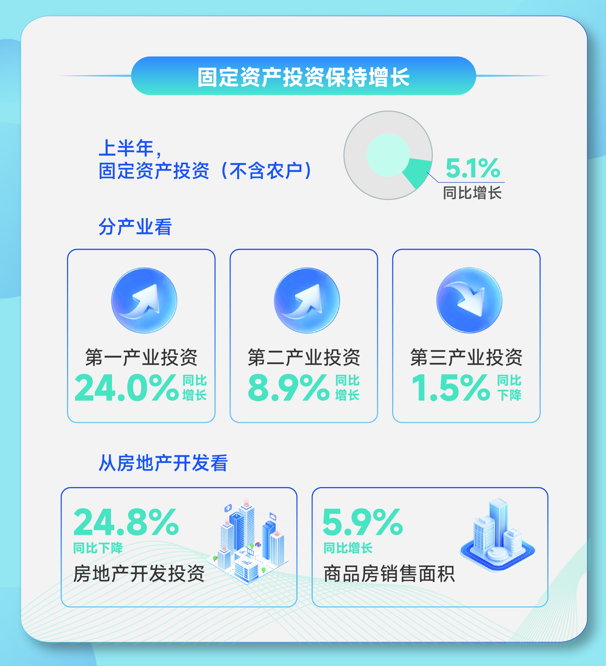 上半年,固定资产投资(不含农户)同比增长5.1%,增速分别高于全国(2.8%)、全省(2.7%)2.3个、2.4个百分点。