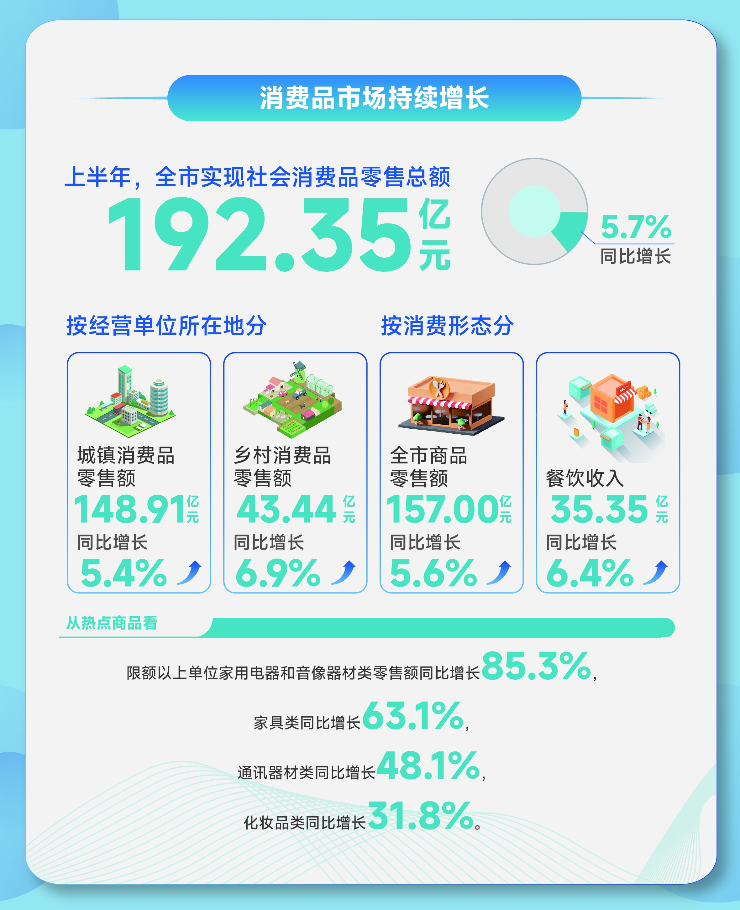 上半年,全市实现社会消费品零售总额192.35亿元,同比增长5.7%,增速分别高于全国(5.0%)、全省(5.6%)0.7个、0.1个百分点。