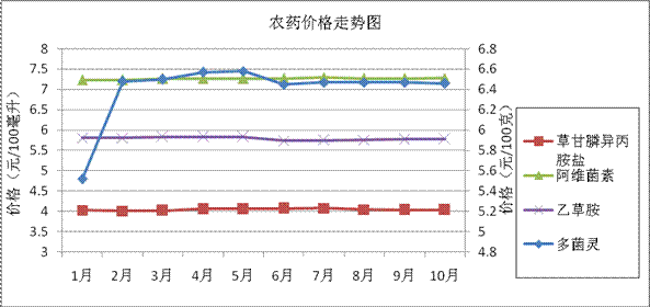与上月相比,化肥类基本持平,综合平均微跌0.01%;所监测的四个农药品种2涨1跌1持平,综合平均微涨0.04%;农膜类平均跌0.39%。与去年同期相比,农资价格整体上涨。化肥类综合平均涨幅4.33%,其中两种复合肥涨幅较大,达17.03%、13.06%;农药类平均涨幅5.54%,其中多菌灵涨23.75%;农膜类均上涨,综合平均涨幅2.02%。