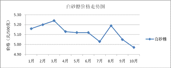 2.食糖类价格。市场供应稳定,价格略有回落。白砂糖平均价格为4.97元/500克,与上月相比跌1.62%,与去年同期相比涨5.34%;