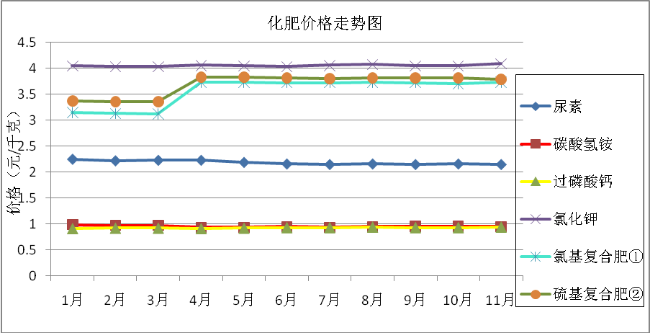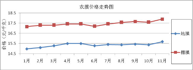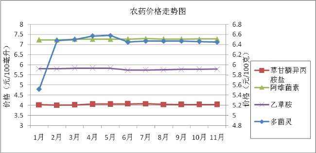 与上月相比,化肥类基本持平,综合平均微涨0.14%;所监测的四个农药品种1涨1跌2持平,综合平均与上月持平;农膜类平均涨1.83%。与去年同期相比,农资价格整体上涨。化肥类综合平均涨幅4.82%,其中两种复合肥涨幅较大,达18.35%、12.80%;农药类平均涨幅5.19%,其中多菌灵涨22.16%;农膜类均上涨,综合平均涨幅3.89%。