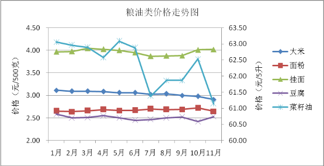 1.粮油类价格。本月货源充足,供需平衡,进价稳定,个别品种受进价、产量、供求等因素影响略有波动。大米平均价格为2.91元/500克,与上月相比跌2.32%;面粉平均价格为2.65元/500克,与上月相比跌2.48%;挂面平均价格为4.02元/500克,与上月相比涨0.15%;豆腐平均价格为2.53元/500克,与上月相比涨4.38%;菜籽油平均价格为61.14元/5升,与上月相比跌2.23%。与去年同期相比,大米跌6.96%,面粉跌0.66%,挂面涨1.07%,豆腐跌3.63%,菜籽油跌3.32%;