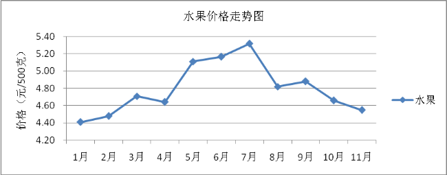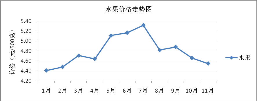6.水果类价格。我市市场中苹果、脐橙等应季水果大量上市,价格降低,与上月相比水果平均价格下降4.21%。