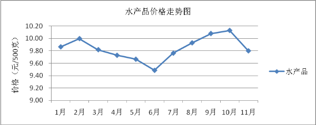 4.水产品类价格。目前平均价格9.80元/500克,与上月相比水产品平均价格跌3.28%,与去年同期相比价格跌2.47%;