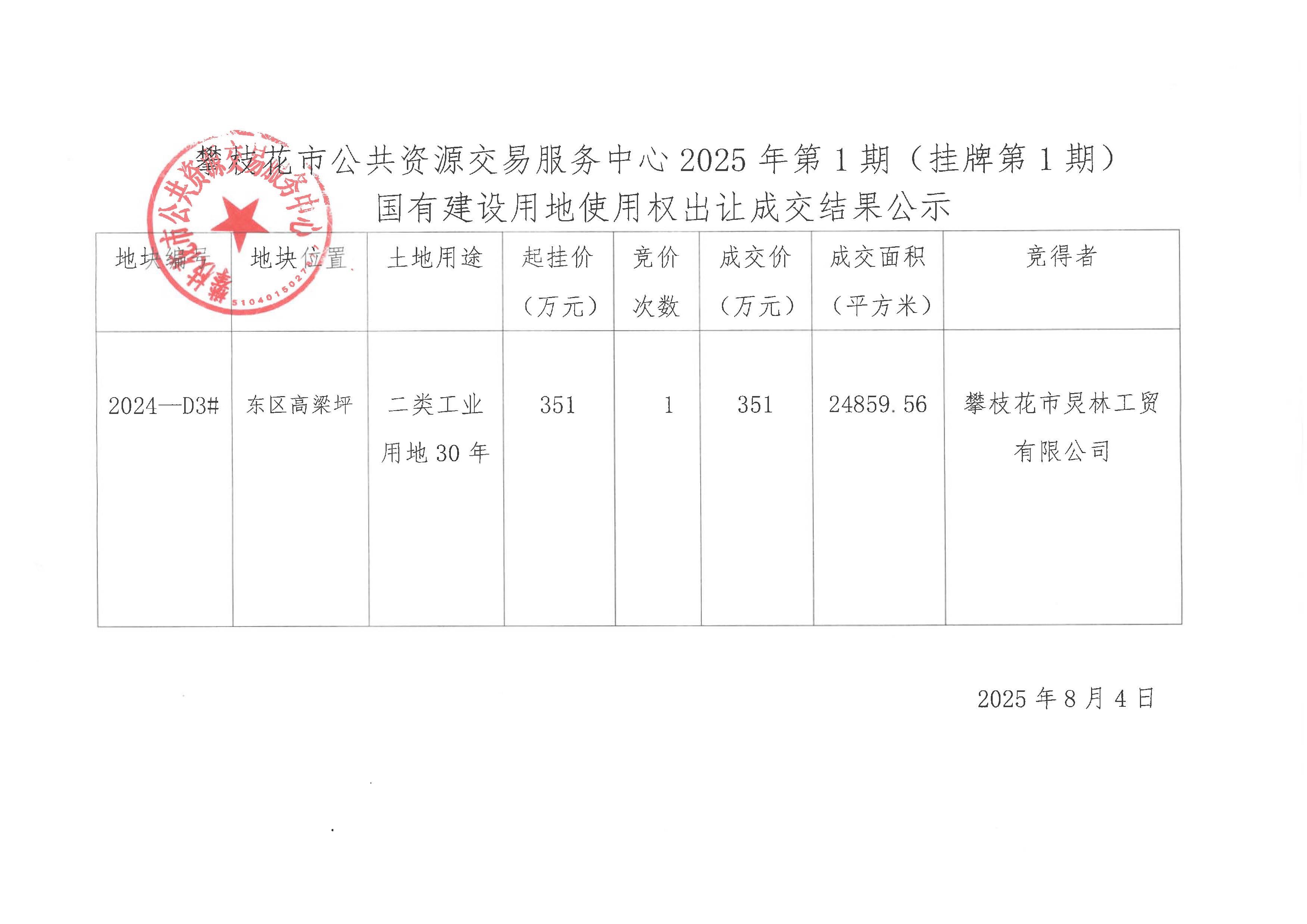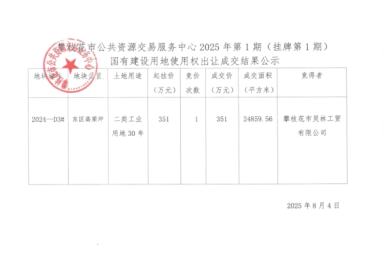 攀枝花市公共资源交易服务中心2025年第1期(挂牌第1期)国有建设用地使用权出让成交结果公示