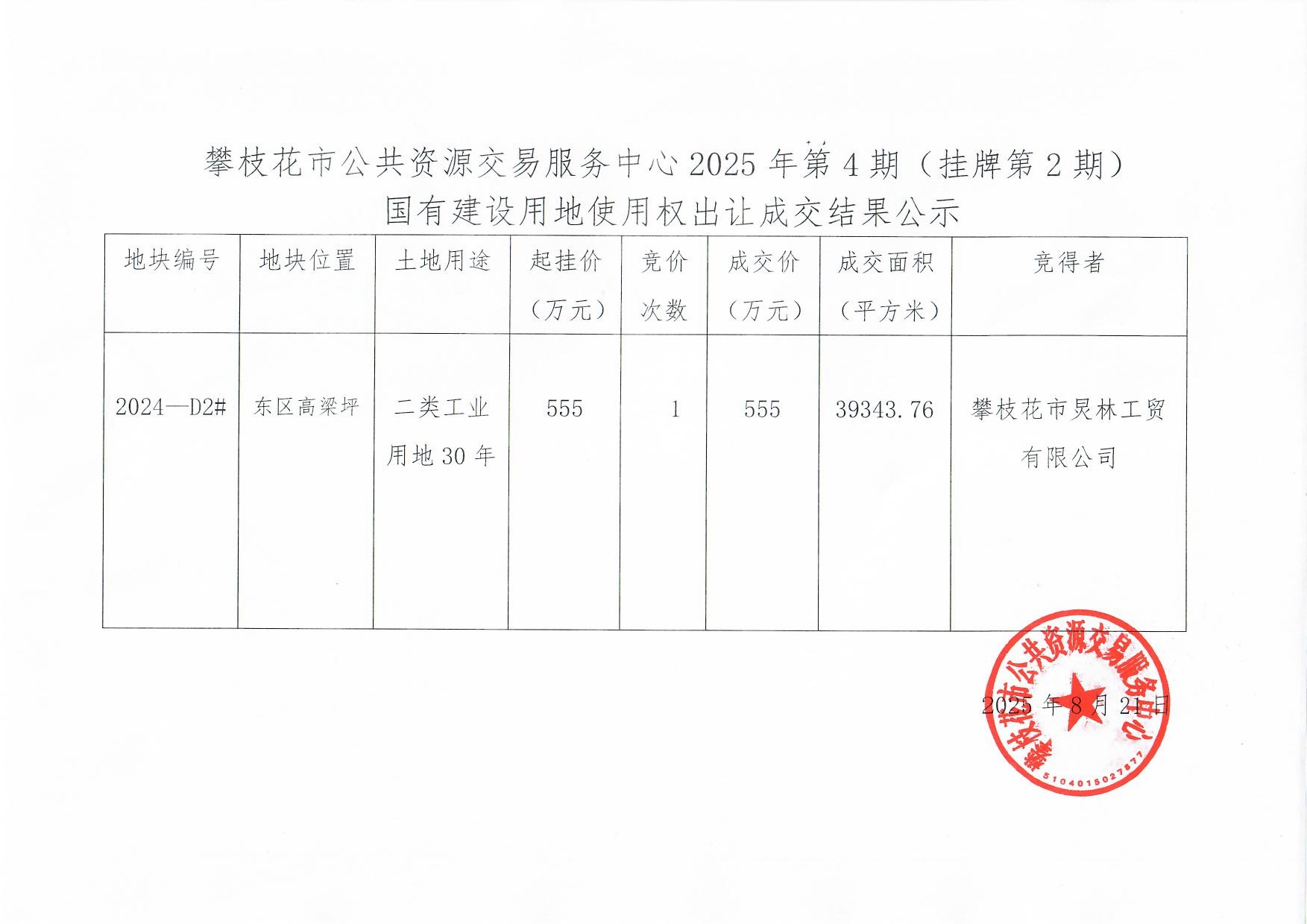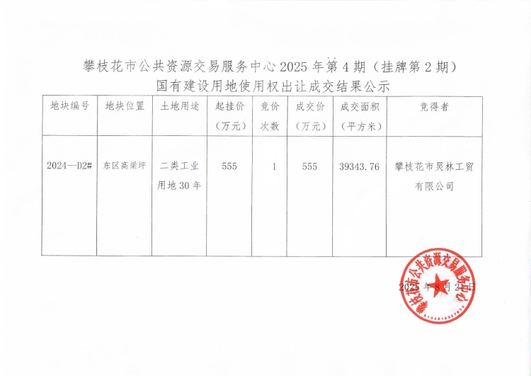 攀枝花市公共资源交易服务中心2025年第4期(挂牌第2期)国有建设用地使用权出让成交结果公示