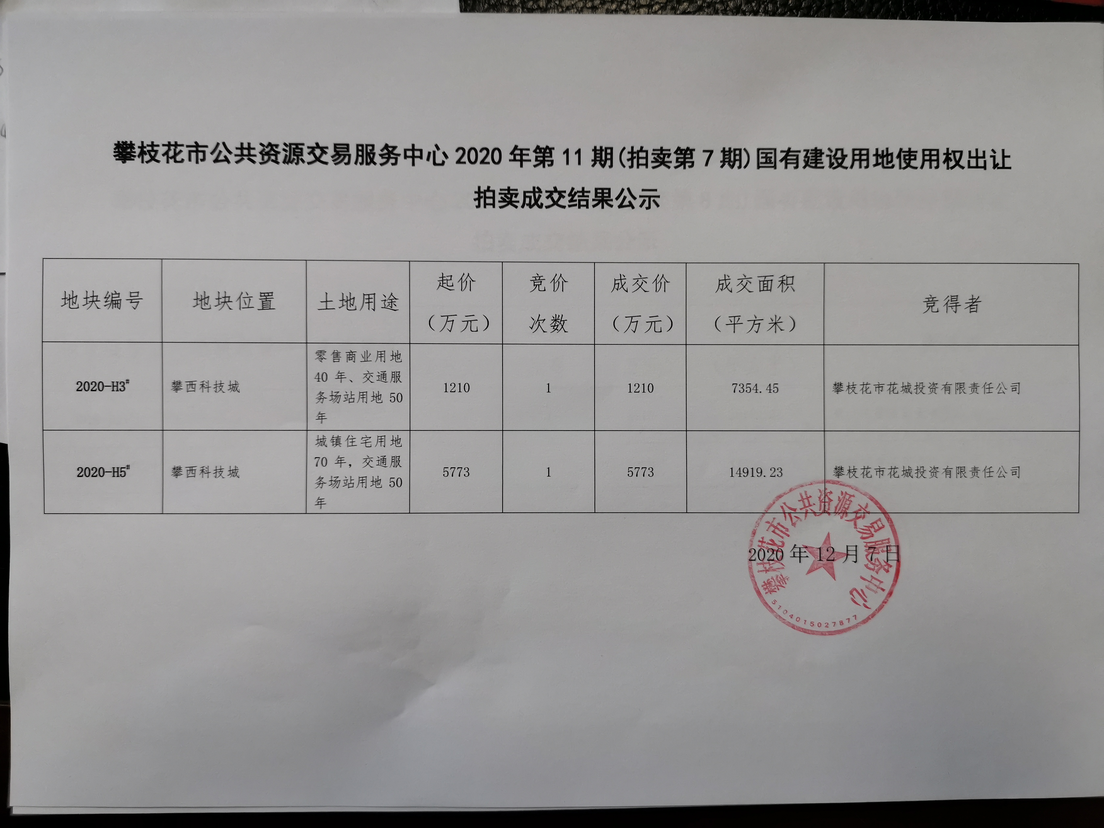 攀枝花市公共资源交易服务中心2020年第11期(拍卖第7期)国有建设用地使用权出让拍卖成交结果公示