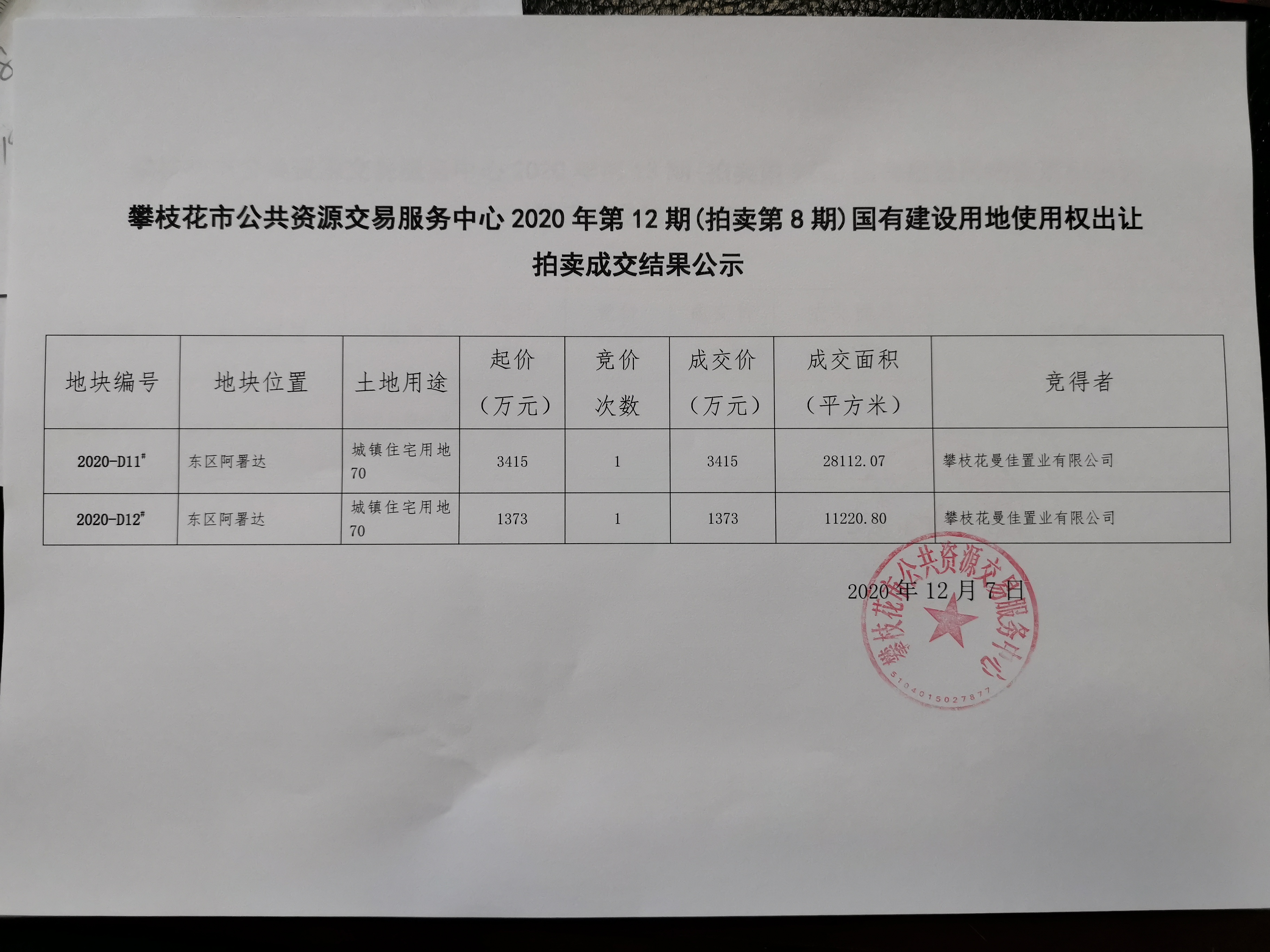 攀枝花市公共资源交易服务中心2020年第12期(拍卖第8期)国有建设用地使用权出让拍卖成交结果公示