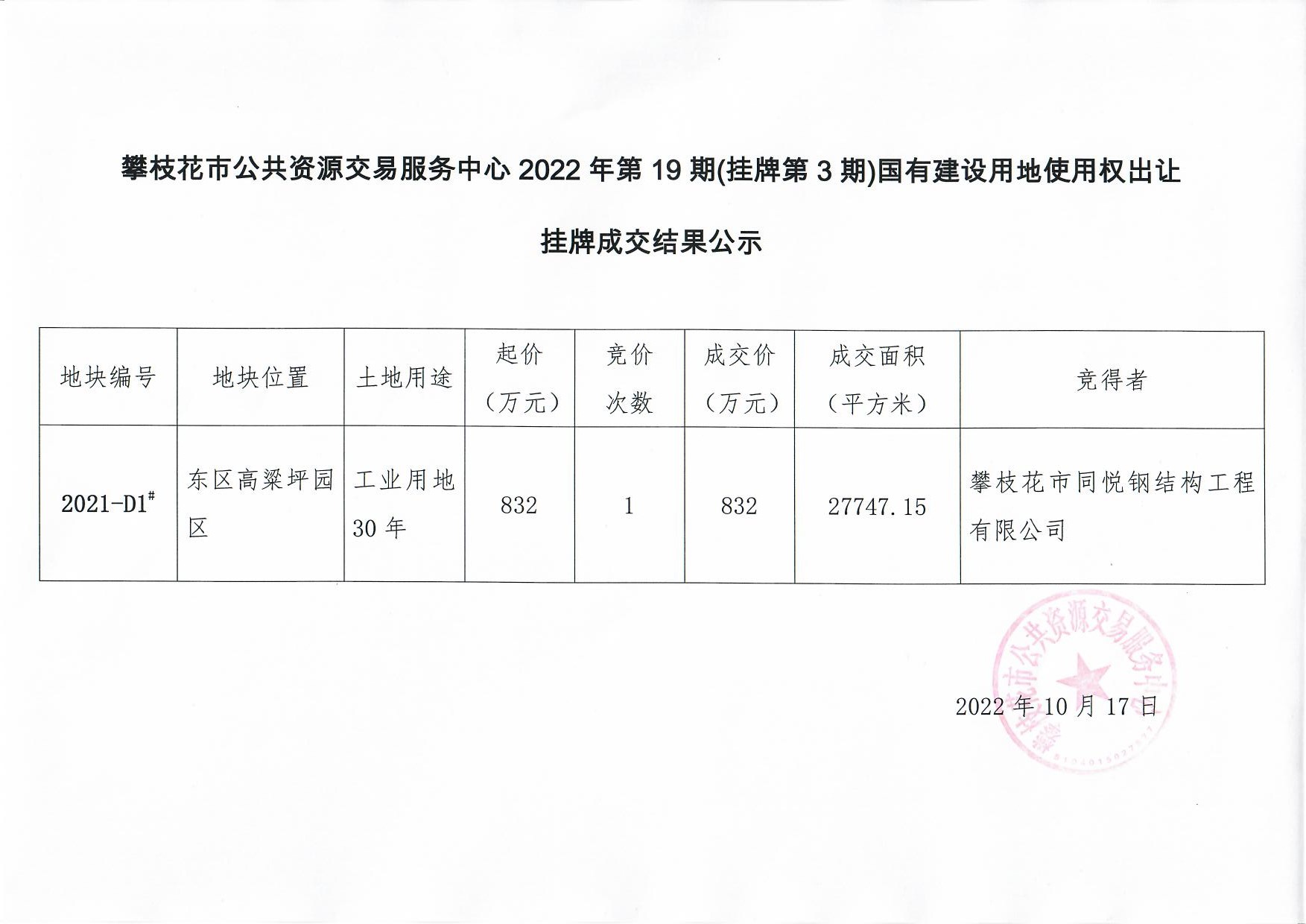 攀枝花市公共资源交易服务中心2022年第19期(挂牌第3期)国有建设用地使用权出让挂牌成交结果公示