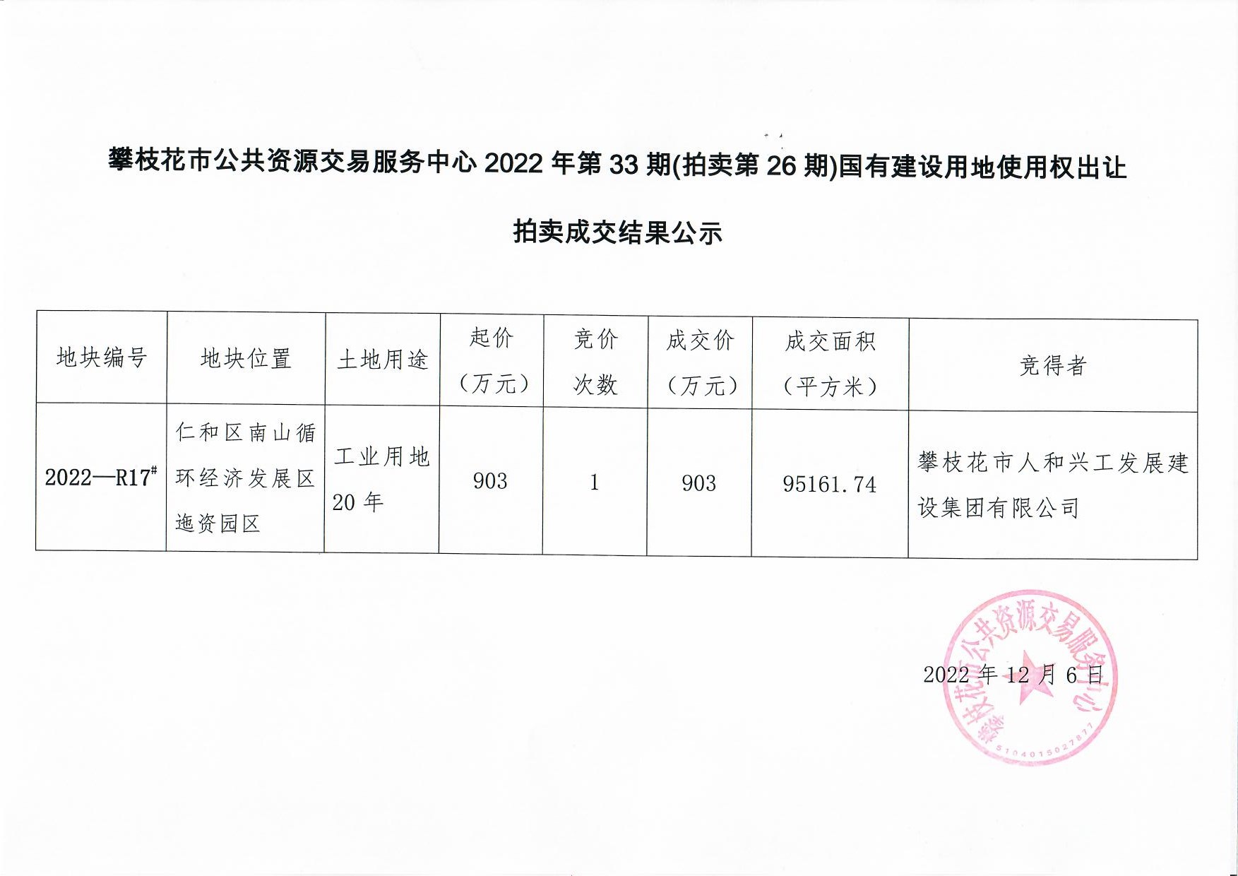 攀枝花市公共资源交易服务中心2022年第33期(拍卖第26期)国有建设用地使用权出让拍卖成交结果公示