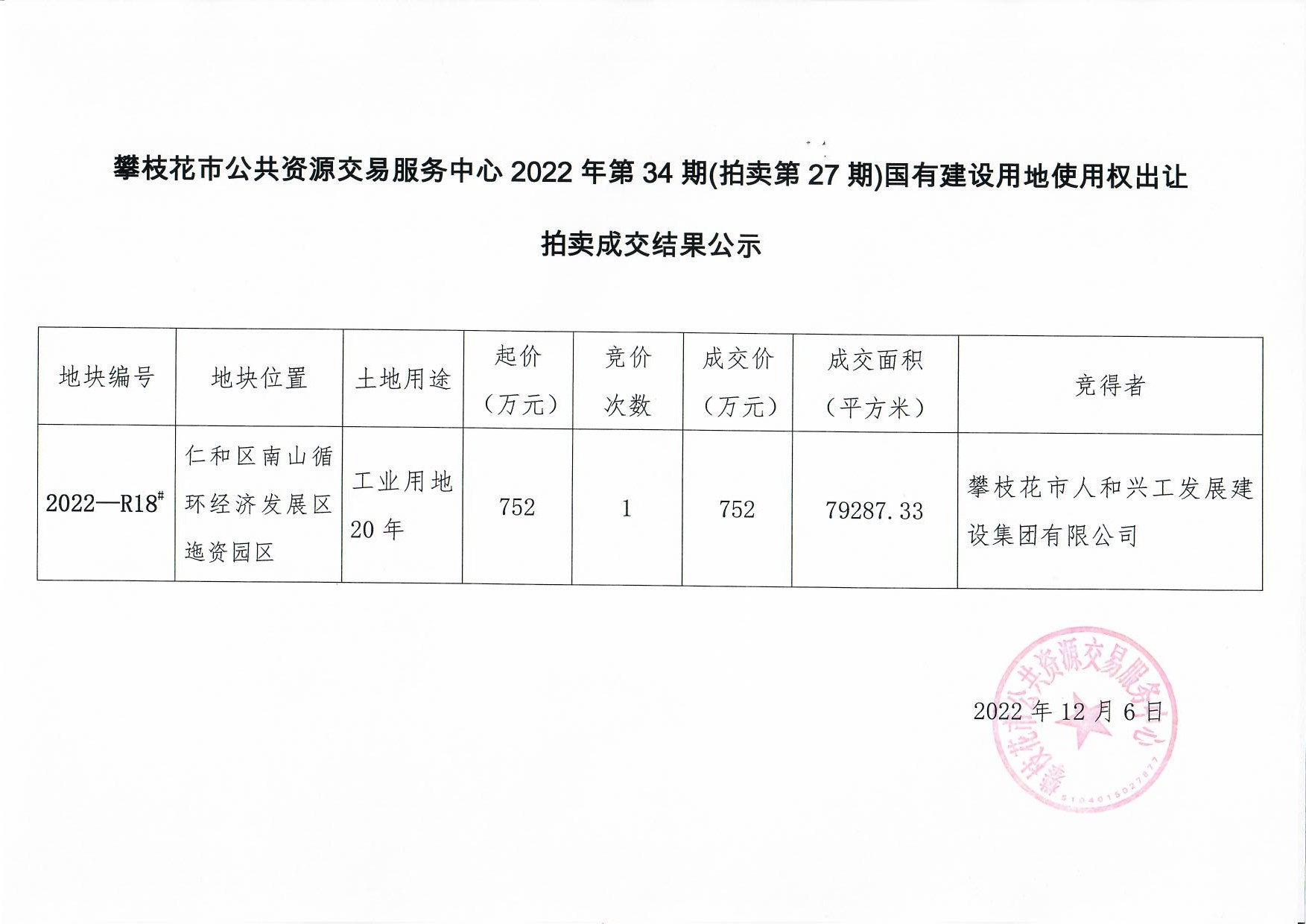攀枝花市公共资源交易服务中心2022年第34期(拍卖第27期)国有建设用地使用权出让拍卖成交结果公示