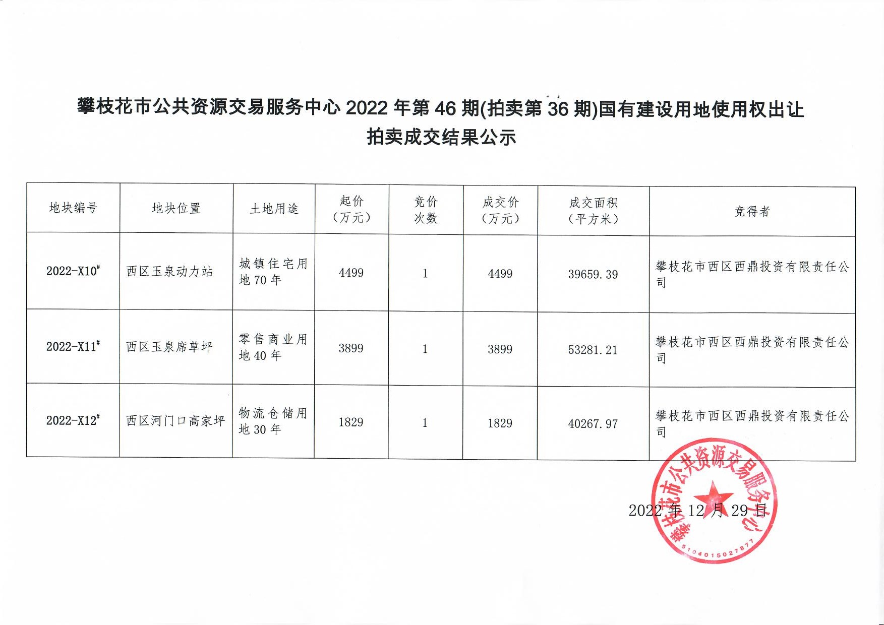攀枝花市公共资源交易服务中心2022年第46期(拍卖第36期)国有建设用地使用权出让拍卖成交结果公示