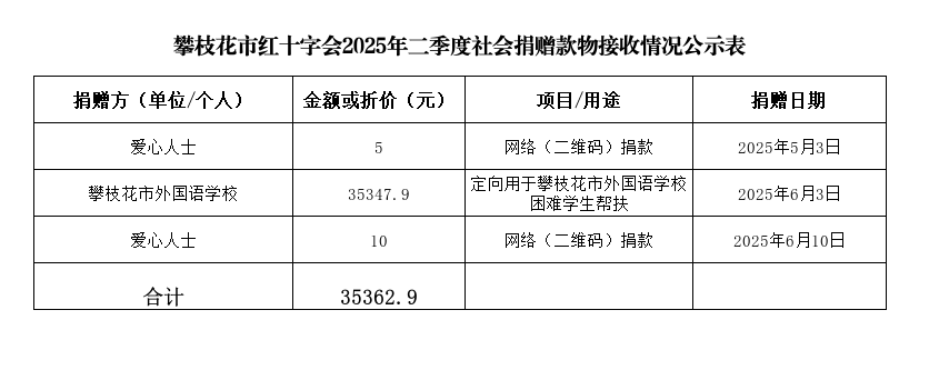攀枝花市红十字会2025年二季度社会捐赠接收情况公示